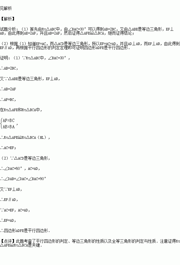 如图,分别以Rt△ABC的直角边AC及斜边AB向外作等边△ACD及等边△ABE,已知:∠BAC=30°,EF⊥AB,垂足为F,连接DF.