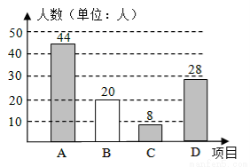2010Ä꿪ʼºÏ·ÊÊпªÕ¹ÁË¡°ÌåÓý¡¢ÒÕÊõ2+1¡±»î¶¯£¬ÎÒУ¸ù¾Ýʵ¼ÊÇé¿ö£¬¾ö¶¨Ö÷Òª¿ªÉèA£ºÆ¹ÅÒÇò£¬B£ºÏóÆå£¬C£ºÀºÇò£¬D£ºÌøÉþÕâËÄÖÖÔ˶¯ÏîÄ¿£®ÎªÁ˽âѧÉúϲ»¶ÄÄÒ»ÖÖÏîÄ¿£¬Ëæ»ú³éÈ¡Á˲¿·ÖѧÉú½øÐе÷²é£¬²¢½«µ÷²é½á¹û»æÖƳÉÈçͼ¼×¡¢ÒÒËùʾµÄÌõÐÎͳ¼ÆÍ¼ºÍÉÈÐÎͳ¼ÆÍ¼£®ÇëÄã½áºÏͼÖеÄÐÅÏ¢½â´ðÏÂÁÐÎÊÌ⣺