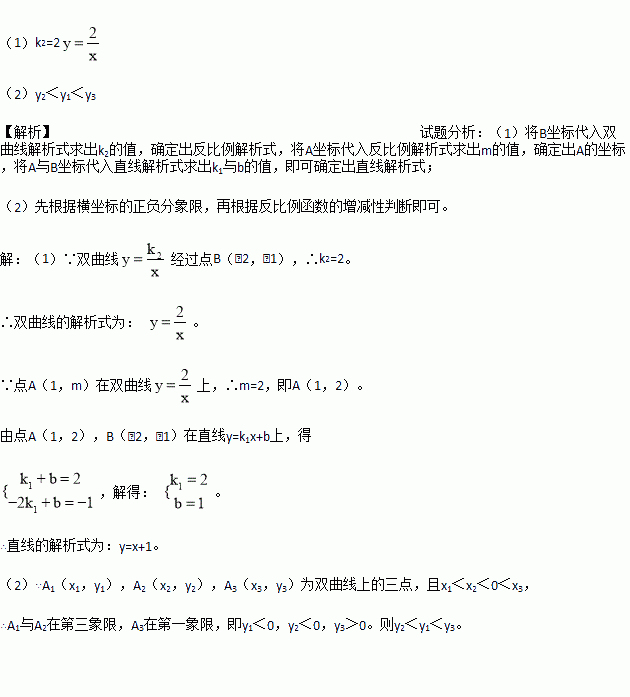 (k2≠0)相交于A(1,m)、B(-2,-1)两点,