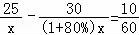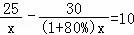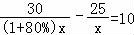 小明乘出租车去体育场,有两条路线可供选择:路线一的全程是25千米,但交通比较拥堵,路线二的全程是30千米,平均车速比走路线一时的平均车速能提高80%,因此能比走路线一少用10分钟到达.若设走路线一时的平均速度为x千米/小时,根据题意,得( )