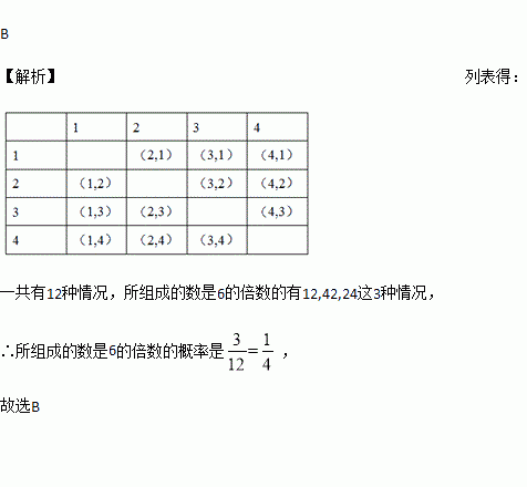 从1、2、3、4中任取一个数作为十位上的数字,再从余下的数字中任取一个数作为个位上的数字,那么组成的两位数是6的倍数的概率是( )