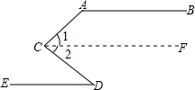 分析:首先过C作CF∥AB,根据平行线的传递性可得AB∥ED∥CF,根据平行线的性质可得∠2=∠D,∠1+∠A=180°,再计算出∠1的度数,进而得到∠2的度数,即可得到∠D的度数.
