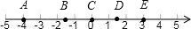 A表示-4,B表示-1.5,C表示0,D表示1,E表示3.
