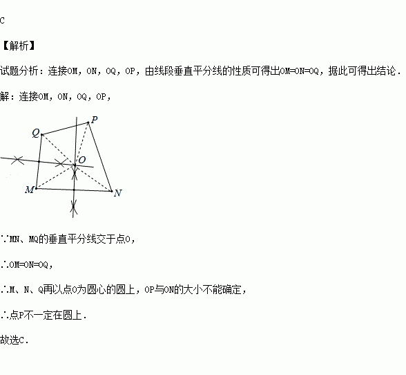 (2015秋•江宁区期末)如图,小明为检验M、N、P、Q四点是否共圆,用尺规分别作了MN、MQ的垂直平分线交于点O,则M、N、P、Q四点中,不一定在以O为圆心,OM为半径的圆上的点是( )