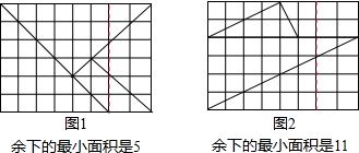 工人张师傅要在两张8×6的矩形钢板上分别切割三个直角三角形,使余下的钢板面积最小.图1、图2分别是矩形钢板的图纸,请你帮助张师傅在图纸上画出切割线,直接写出余下钢板的最小面积.