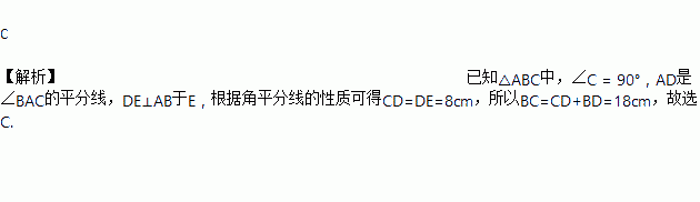 如图,△ABC中,∠C = 90°,AD是∠BAC的平分线,DE⊥AB于E,若DE = 8cm,DB = 10cm则BC等于( )
