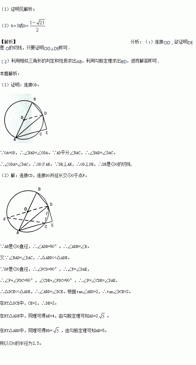 (2)若tan∠ABD=2,CE=1,求⊙O的半径。