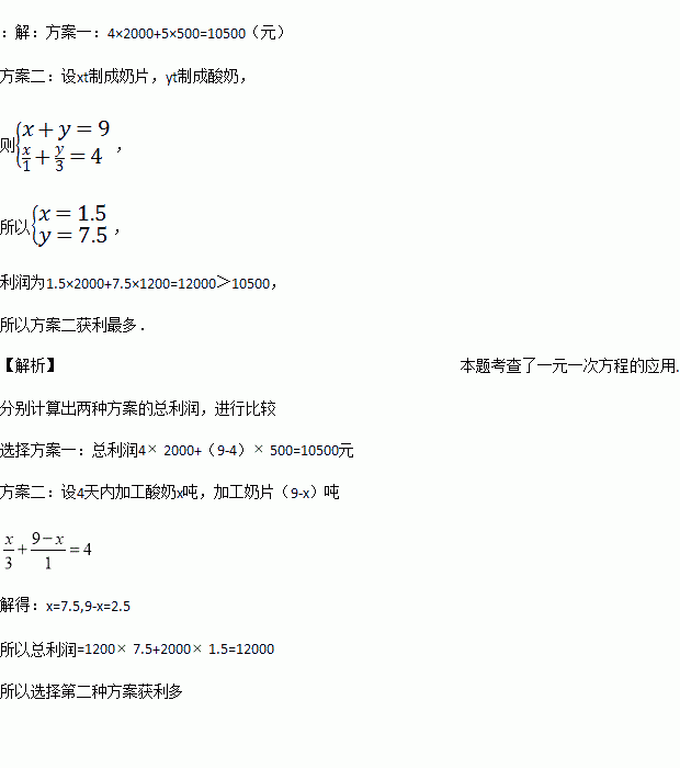 方案二:将一部分制成奶片,其余制成酸奶销售,并恰好4天完成。