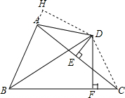 分析 (1)①作DH⊥BA交BA的延长线于H,连接DC,根据角平分线的性质得到DF=DH,由DE垂直平分AC,得到AD=CD,推出Rt△ADH≌Rt△CDF,根据全等三角形的性质得到AH=CF,BH=BF,根据线段的和差即可得到结论;②同理BC+BA=BF+CF+BA=BF+AH+BA=BF+BH=2BF;