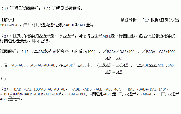 BAC=40°,将△ABC绕点A按逆时针方向旋转100°得到△ADE,连接BD,CE交于点F.