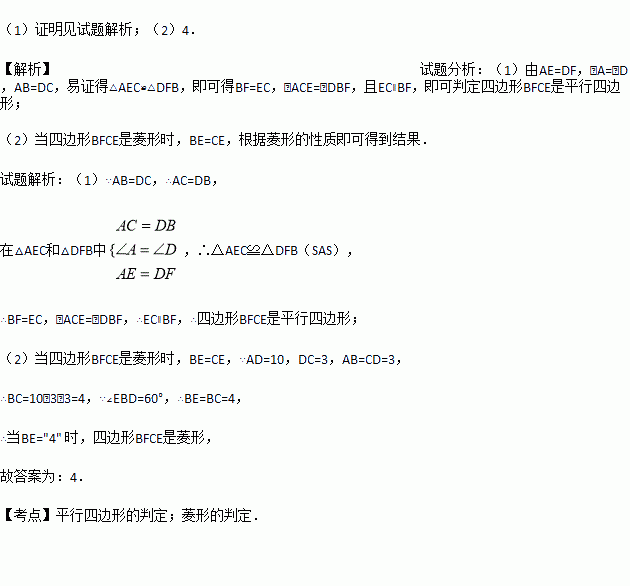 (2)若AD=10,DC=3,∠EBD=60°,则BE= 时,四边形BFCE是菱形.