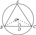 解答 解:连接OC、OB,作OD⊥BC于D,∵∠BOD=360°÷3÷2=60°,OB=4,∴BD=2$\sqrt{3}$cm,则BC=4$\sqrt{3}$cm,∴圆内等边三角形的边长4$\sqrt{3}$cm.