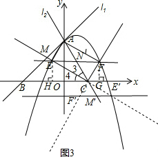 分析 (1)根据已知函数l1的解析式求出点A.B的坐标,再根据OC,OB的关系,从而求出OC,得到点C的坐标,进一步求出l2的解析式,CE.CF分别是∠ACB及其外角的平分线,得到∠3=∠4,∠1=∠2,再有对应线段成比例,得直线MN∥BC,得到角相等,从而得到线段相等;
