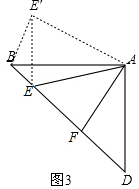 (3)把△AFD绕点A顺时针旋转90°得到△AEE′,连接EE′,根据旋转的性质,可知△AFD≌△ABE′得到BE′=FD,AE′=AF,∠D=∠ABE′,∠EAD=∠E′AB,在Rt△ABD中的,AB=AD,可求得∠E′BD=90°,所以E′B2+BE2=E′E2,证△AE′E≌△AE′F,利用FE=EE′得到EF2=BE2+FD2.