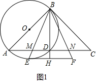 (2)如图2中,连接AE、DE.由△AME∽△BMD,推出$\frac{AE}{EM}$=$\frac{BD}{DM}$=2,设EM=a,AE=2a,则AM=$\sqrt{5}$a,BD=AD=2$\sqrt{5}$a,推出AB=$\sqrt{2}$BD=2$\sqrt{10}$a,BE=$\sqrt{A{B}^{2}-A{E}^{2}}$=6a,推出tan∠ABE=$\frac{AE}{BE}$=$\frac{1}{3}$,由AC∥EF,BH⊥AC,推出BH⊥EF,∠DEH=∠EDA=∠ABE,推出tan∠DEH=$\frac{1}{3}$=$\frac{DH}{EH}$,求出EH即可解决问题;