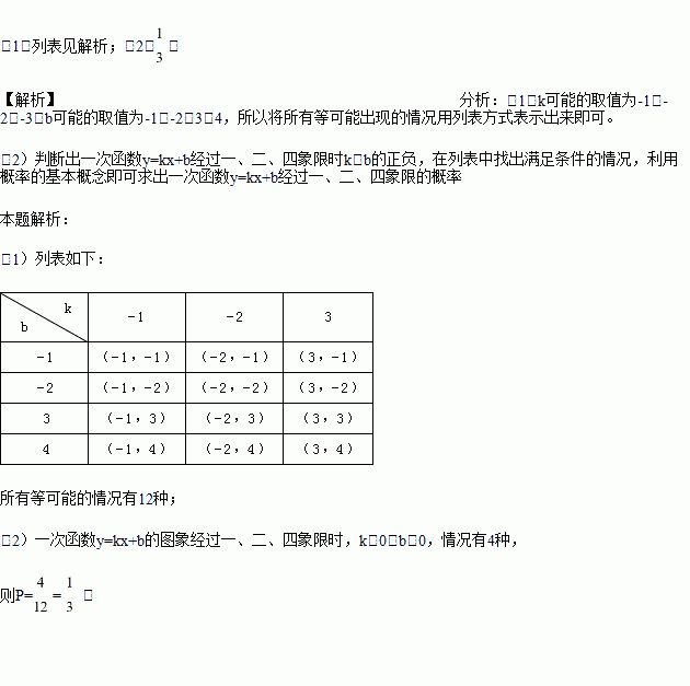 (2)求一次函数y=kx+b的图象经过一、二、四象限的概率.
