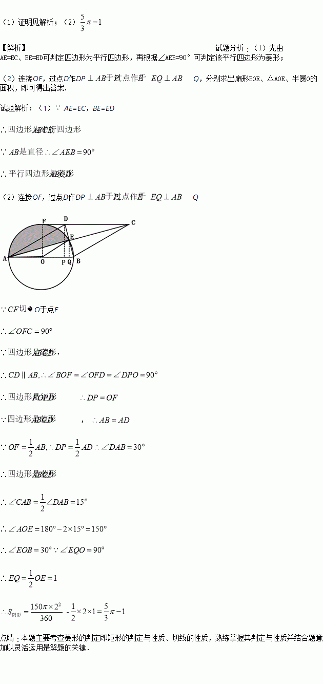 (2)若CD的延长线与圆相切于点F,已知直径AB=4.求阴影部分的面积.