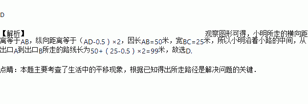 如图是某公园里一处矩形风景欣赏区ABCD,长AB=50米,宽BC=25米,为方便游人观赏,公园特意修建了如图所示的小路(图中非阴影部分),小路的宽均为1米,那小明沿着小路的中间,从出口A到出口B所走的路线(图中虚线)长为( )