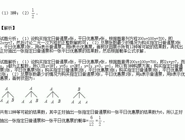 (2)如果从上述方案中选中一种总票张数最少的情况,将所购的票的票面朝下随意叠放在一起,随机抽两张,求正好抽出一张指定日普通票和一张平日优惠票的概率.