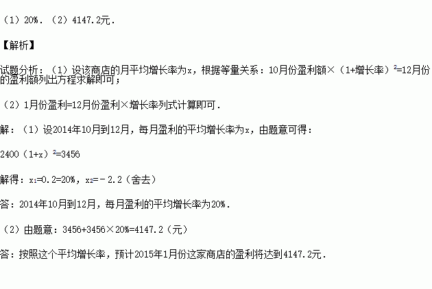 (1)求2014年10月到12月,每月盈利的平均增长率;