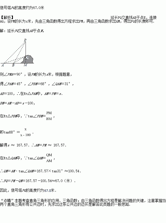 如图所示,某教学活动小组选定测量小山上方某信号塔PQ的高度,他们在A处测得信号塔顶端P的仰角为45°,信号塔低端Q的仰角为31°,沿水平地面向前走100米到处,测得信号塔顶端P的仰角为68°.求信号塔PQ的高度.(结果精确到0.1米.参考数据:sin68°≈ 0.93,cos68° ≈ 0.37,tan68° ≈ 2.48,tan31° ≈ 0.60,sin31° ≈ 0.52,cos31°≈0.86)