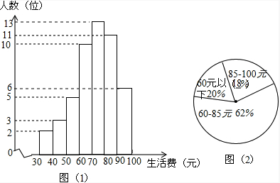 (2)根据生活费在80元以上,少于100元(含80元,不含100元)的有17位和80-90元的人数,求出90-100元的人数,再用总人数减去其它人数求出70-80元的人数,从而补全条形统计图,再用整体1减去60元以下和60-85元所占的百分比求出85-100元所占的百分比,即可补全扇形统计图;