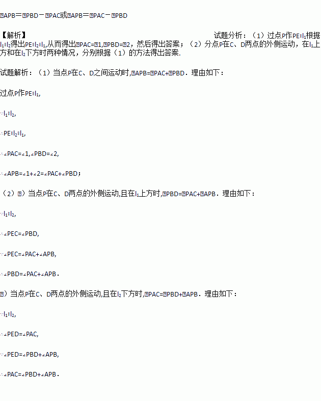 (2)若点P在C、D两点的外侧运动时(P点与点C、D不重合),试探索∠PAC,∠APB,∠PBD之间的关系又是如何?