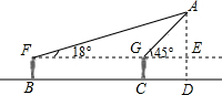 如图,为了知道空中一静止的广告气球A的高度,小宇在B处测得气球A的仰角为18°,他向前走了20m到达C处后,再次测得气球A的仰角为45°,已知小宇的眼睛距地面1.6m,求此时气球A距地面的高度(结果精确到0.1m).