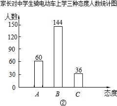 中学生骑电动车上学的现象越来越受到社会的关注.为此某媒体记者小李随机调查了城区若干名中学生家长对这种现象的态度(态度分为:A:无所谓;B:反对;C:赞成)并将调査结果绘制成图①和图②的统计图(不完整)请根据图中提供的信息,解答下列问题: