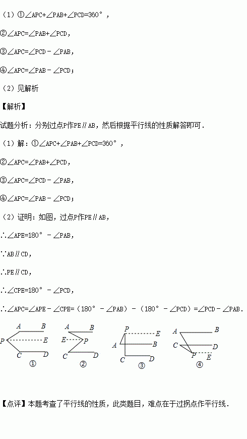 如图,已知AB∥CD,请分别判断下面四个图形中∠APC、∠PAB、∠PCD之间的关系.