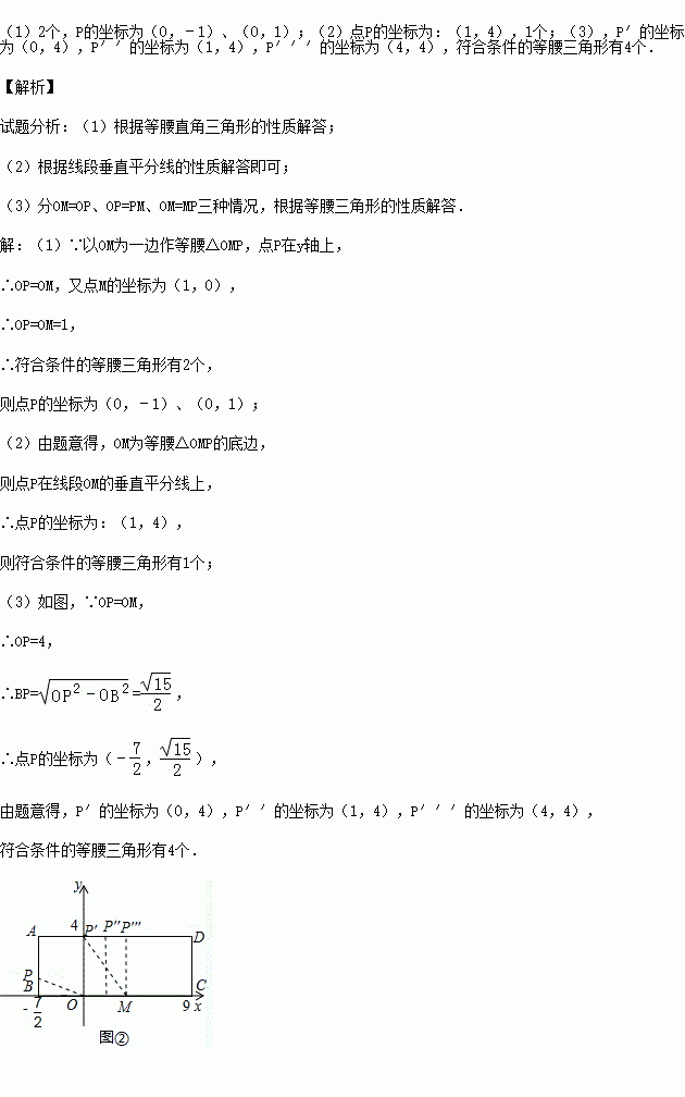 (2)若点M的坐标为(1,0),如图①,以OM为一边作等腰△OMP,使点P落在长方形ABCD的一边上,则符合条件的等腰三角形有几个?请直接写出所有符合条件的点P的坐标.