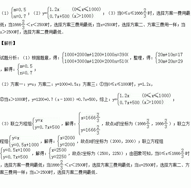 (1)若机场方面选用方案二和方案三各印刷2000份材料需花费3900元,选用方案二和方案三各印刷3000份材料需花费5100元,请求出m和n的值;