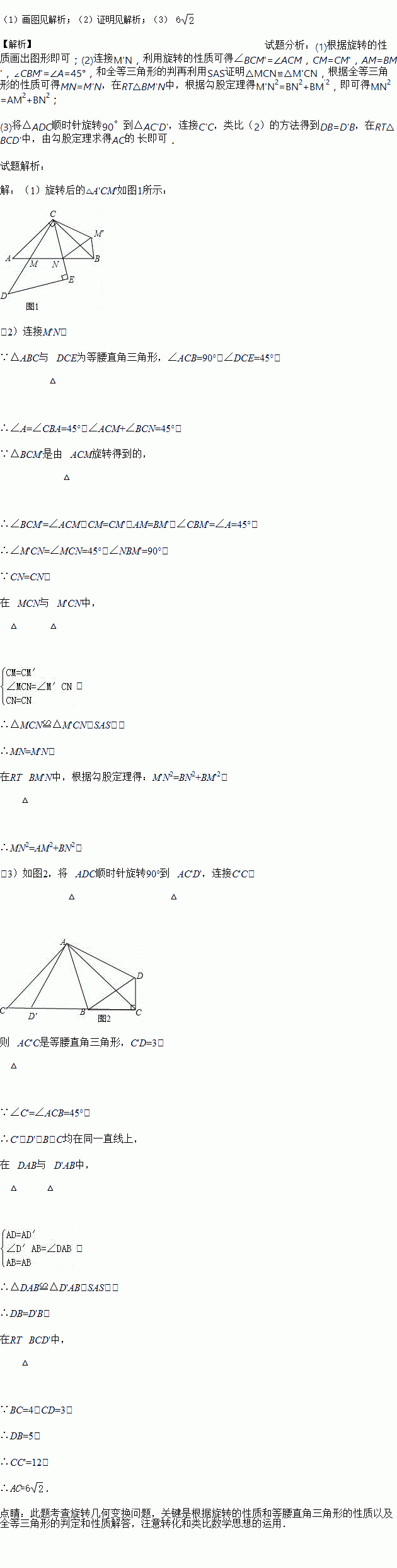 (3)如图2,在四边形ABCD中,∠BAD=45°,∠BCD=90°,AC平分∠BCD,若BC=4,CD=3,则对角线AC的长度为多少?(直接写出结果即可,但在图中保留解决问题的过程中所作辅助线、标记的有关计算数据等)
