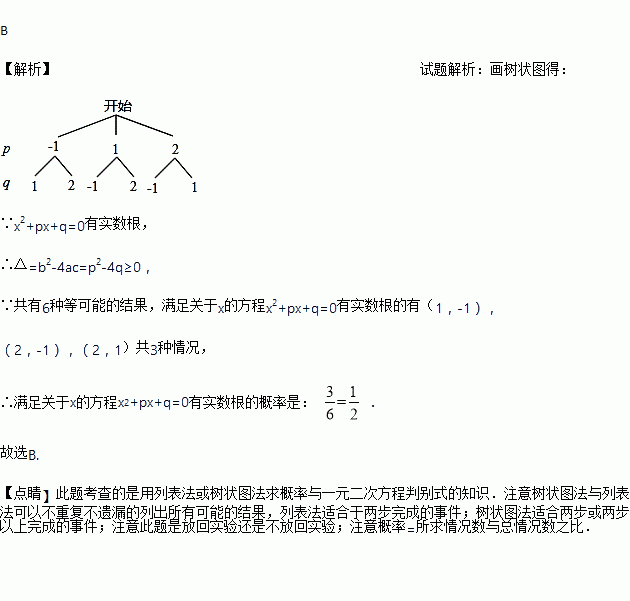 一个盒子里有完全相同的三个小球,球上分别标有数字-1、1、2.随机摸出一个小球(不放回)其数字记为p ,再随机摸出另一个小球其数字记为q ,则满足关于的方程