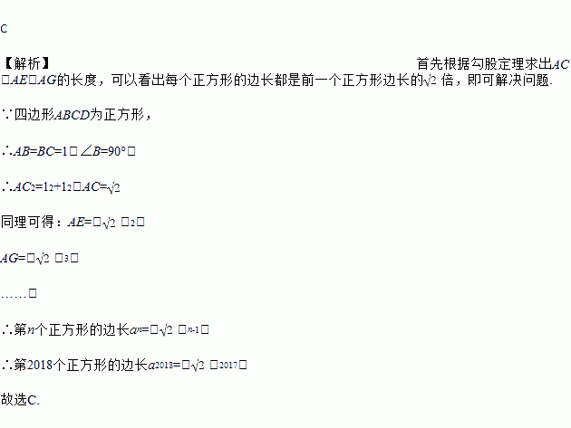 如图,正方形ABCD的边长为1,以对角线AC为边作第二个正方形ACEF,再以对角线AE为边作第三个正方形AEGH,如此下去,则第2018个正方形的边长为