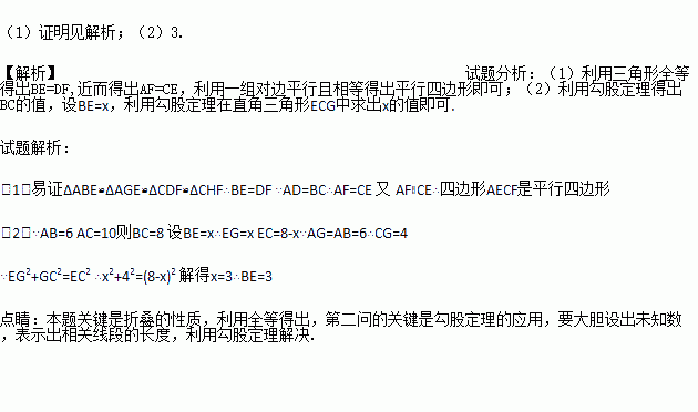 如图,在矩形ABCD中,AC是对角线,E、F分别在BC、AD边上,将边AB沿AE折叠,点B落在对角线AC上的G处,将边CD沿CF折叠,点D落在对角线AC上的点H处 .