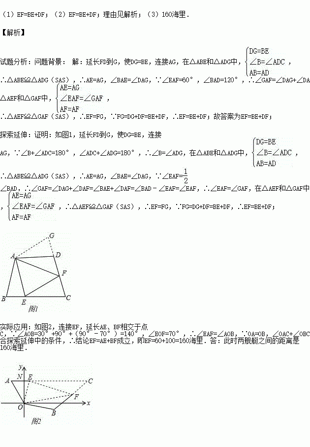 如图(3),在某次军事演习中,舰艇甲在指挥中心(O处)北偏西30°的A处,舰艇乙在指挥中心(O处)南偏东70°的B处,并且两舰艇到指挥中心的距离都是90海里,接到行动指令后,舰艇甲向正东方向以60海里/小时的速度前进,同时,舰艇乙沿着射线BM的方向(∠OBF=120°),以14海里/小时的速度前进1.5小时后,指挥中心观测到甲、乙两舰艇分别到达E,F处,且舰艇乙在指挥中心南偏东80°,试问,两舰艇E,F之间的距离是否符合(2)的条件?如果符合,请求出两舰艇之间的距离(画出辅助线);如果不符合,请说明理由.