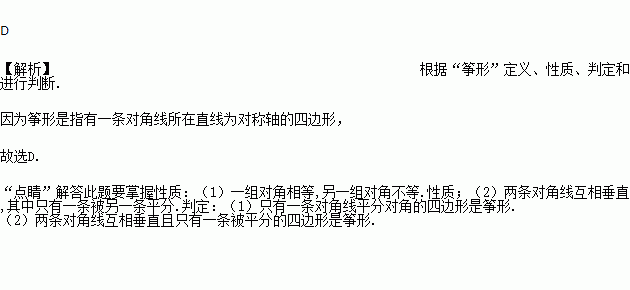 将两个底边相等的等腰三角形按照图所示的方式拼接在一起(隐藏互相重合的底边)的图形俗称为“筝形”.假如“筝形”下个定义,那么下面四种说法中,你认为最能够描述“筝形”特征的是 ( )