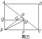 (4)当△BOM为直角三角形时,∠BOM=90°,如图⑦由∠ABO=∠BAO,∠ABC=∠BQG,推出△ABC∽△BGQ,根据相似三角形的性质得到$\frac{AB}{AC}=\frac{QB}{BG}$,于是得到BG=$\frac{5}{3}$x,同理QG=$\frac{4}{3}$x,求出OG=$\frac{5}{2}$-$\frac{5}{3}$x,MG=2x-$\frac{4}{3}$x=$\frac{2}{3}$x,通过△QGB∽△OMG,于是得到$\frac{OG}{QG}=\frac{GM}{BG}$,列方程即可得到结果.