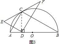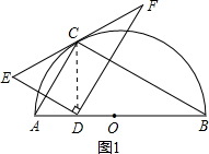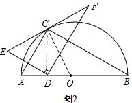 ②连接DC、OC,如图2,易证△AOC是等边三角形,AD=OD,根据等腰三角形的“三线合一”可求出∠ACD,进而可求出∠ECO=90°,即可得到EF与半圆相切;