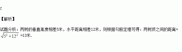 如图,有两棵树,一棵高9米,另一棵高4米,两树相距12米.一只小鸟从一棵树的树梢飞到另一棵树的树梢,至少飞了多少米?( )
