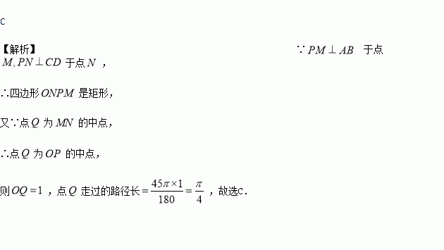 如图,⊙O的半径为2,AB,CD是互相垂直的两条直径,点P是⊙O上任意一点(P与AB,C,D不重合),过点P作PM⊥AB于点M,PN⊥CD于点N,点Q是MN的中点,当点P沿着圆周转过45°时,点Q走过的路径长为( )