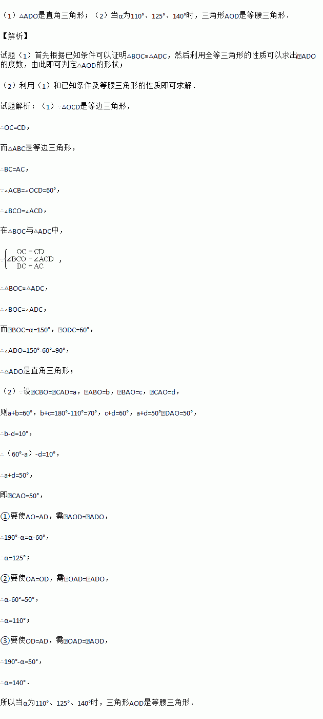 (1)当α=150°时,试判断△AOD的形状,并说明理由;