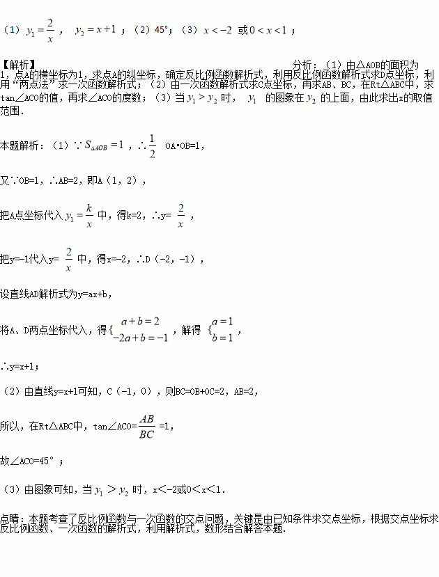 的图象相交于点A和点D,且点A的横坐标为1,点D的纵坐标为-1.过点A作AB⊥x轴于点B,△AOB的面积为1.