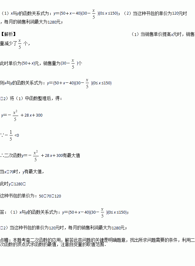(2)如果你是经理,为使每月的销售利润最大,那么你确定这种书包的单价为多少元?此时,最大利润是多少元?