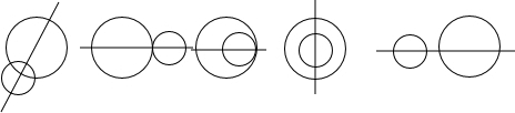 两个大小不同的圆可以组成以下五种图形,如图所示,请画出任两个图形的对称轴,并说一说对称轴有什么共同特点.