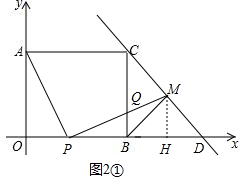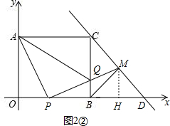 £¨3£©Èçͼ2¢Ù£¬¹ýµãM×÷MH¡ÍBDÓÚH£®Ò×Ö¤MB=MD£¬¡ÏBMD=90¡ã£¬¸ù¾ÝµÈÑüÈý½ÇÐεÄÐÔÖʼ°Ö±½ÇÈý½ÇÐÎб±ßÉϵÄÖÐÏßµÈÓÚб±ßµÄÒ»°ë¿ÉµÃBH=HD=MH=$\frac{1}{2}$BD=2£¬Çó³öOH£¬¼´¿ÉµÃµ½µãMµÄ×ø±ê£®¢ÙÈçͼ2¢Ù£¬Ò×Ö¤¡÷AOP¡×¡÷PHM£¬¸ù¾ÝÏàËÆÈý½ÇÐεÄÐÔÖʼ´¿ÉÇó³öOP£¬¼´¿ÉµÃµ½µãPµÄ×ø±ê£»¢ÚÈçͼ2¢Ú£¬Ò×Ö¤¡÷AOP¡×¡÷PBQ£¬ÔòÓÐ$\frac{AO}{PB}$=$\frac{AP}{PQ}$£®ÓÉPB=OP=2¿ÉµÃ$\frac{AO}{OP}$=$\frac{AP}{PQ}$£®ÔÙÓÉ¡ÏAOP=¡ÏAPQ=90¡ã¿ÉµÃ¡÷AOP¡×¡÷APQ£®