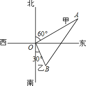 解答 解:如图所示,∵甲往北偏东60°的方向走了12km,乙往南偏东30°的向走了5km,∴∠AOB=90°,∴AB=$\sqrt{{OA}^{2}+{OB}^{2}}$=$\sqrt{{12}^{2}+{5}^{2}}$=13(km).故答案为:13.