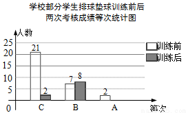取部分学生,统计了训练前后两次考核成绩,并按“A,B,C”三个等次绘制了如图不完整的统计图.试根据统计图信息,解答下列问题: