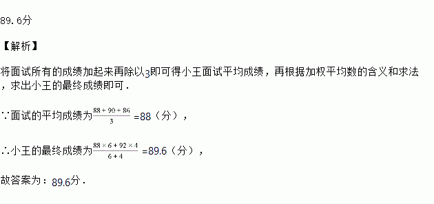 如果面试平均成绩与笔试成绩按6:4的比确定,请计算出小王的最终成绩_____.